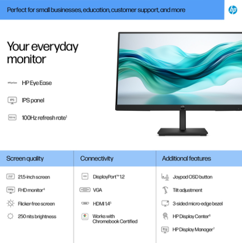 With versatility in connectivity options, the HP 322pf includes HDMI, VGA, and DisplayPort inputs, ensuring compatibility with various devices. The 178-degree horizontal and vertical viewing angles enhance collaboration, making it easier for multiple users to enjoy the display from different positions. Its three-sided borderless design looks sleek and maximizes the screen area for a more engaging view. Coupled with a detachable stand and VESA interface support, this monitor can be adapted to various setups for productivity.