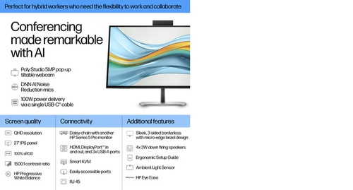 With a multitude of connectivity options including HDMI, DisplayPort, and USB-C, the HP 527pm supports versatile setups for both work and entertainment. The built-in USB 3.2 Gen 1 hub allows quick access to peripherals, while the built-in camera with an IR sensor facilitates seamless video conferencing. Durability is enhanced with a backlight life of 30,000 hours, making it a reliable choice for any environment, whether at home or in the office.