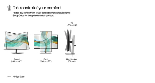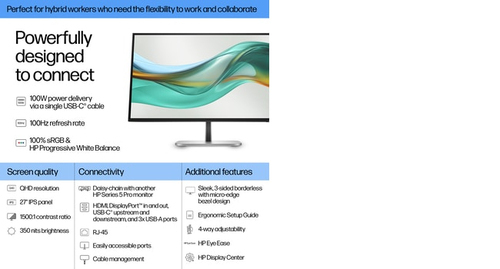 The HP 527pu is designed to enhance productivity and deliver stunning visuals. This 27-inch desktop monitor features a native resolution of 2560 x 1440, providing clarity for all tasks. With IPS technology, users can enjoy wide viewing angles and vibrant colors, ensuring that content looks great from any position. The monitor's anti-glare coating reduces reflections, making it ideal for bright environments, while the 350 cd/m2 brightness ensures that details stand out. Users will appreciate the multiple connectivity options, including HDMI, DisplayPort, and USB-C, allowing for easy integration with various devices. The built-in USB hub and Ethernet capabilities enhance functionality by simplifying connections and providing power delivery of up to 100 watts. This monitor is equipped with features like Low Blue Light technology and Flicker-Free technology, ensuring comfortable viewing for extended periods. The detachable stand and height adjustment, combined with pivot and swivel functionalities, provide flexibility in ergonomics, allowing users to create their preferred workspace.