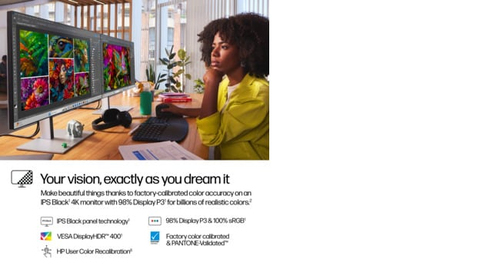 Discover the perfect blend of form and function with the HP 727pk monitor, designed to meet the needs of professionals and enthusiasts alike. This 27-inch 4K IPS display not only delivers stunning visuals with HDR400 support but also boasts color accuracy that satisfies the demands of creative professionals, thanks to its 100% sRGB and 98% DisplayP3 color gamuts.