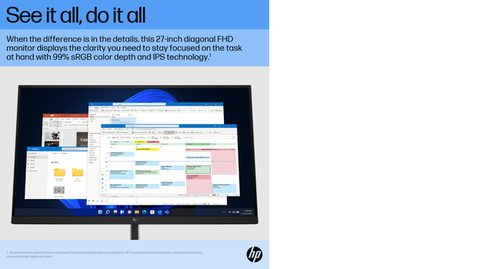 Intentionally crafted to deliver crisp visuals, personalized comfort, and true flexibility, the HP E27 G5 FHD Monitor redefines comfort, so there's nothing between you and your best. Stylishly designed with the planet in mind, this display is the perfect fit for both the office and home.